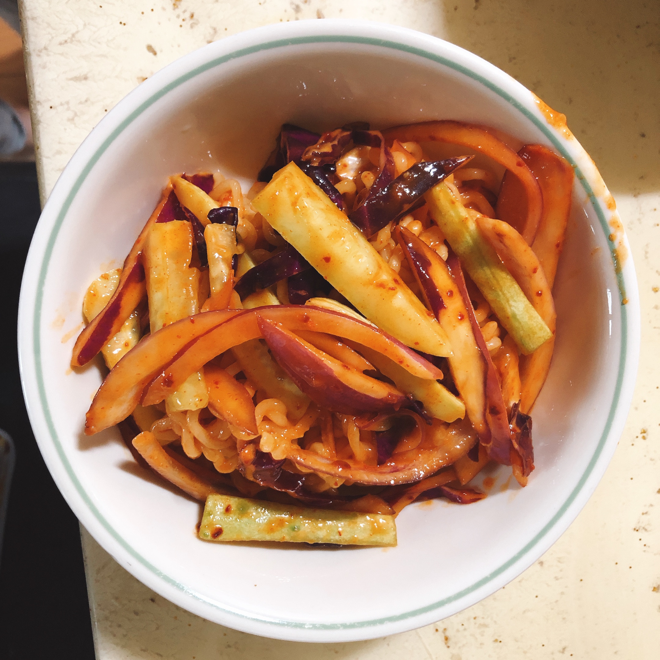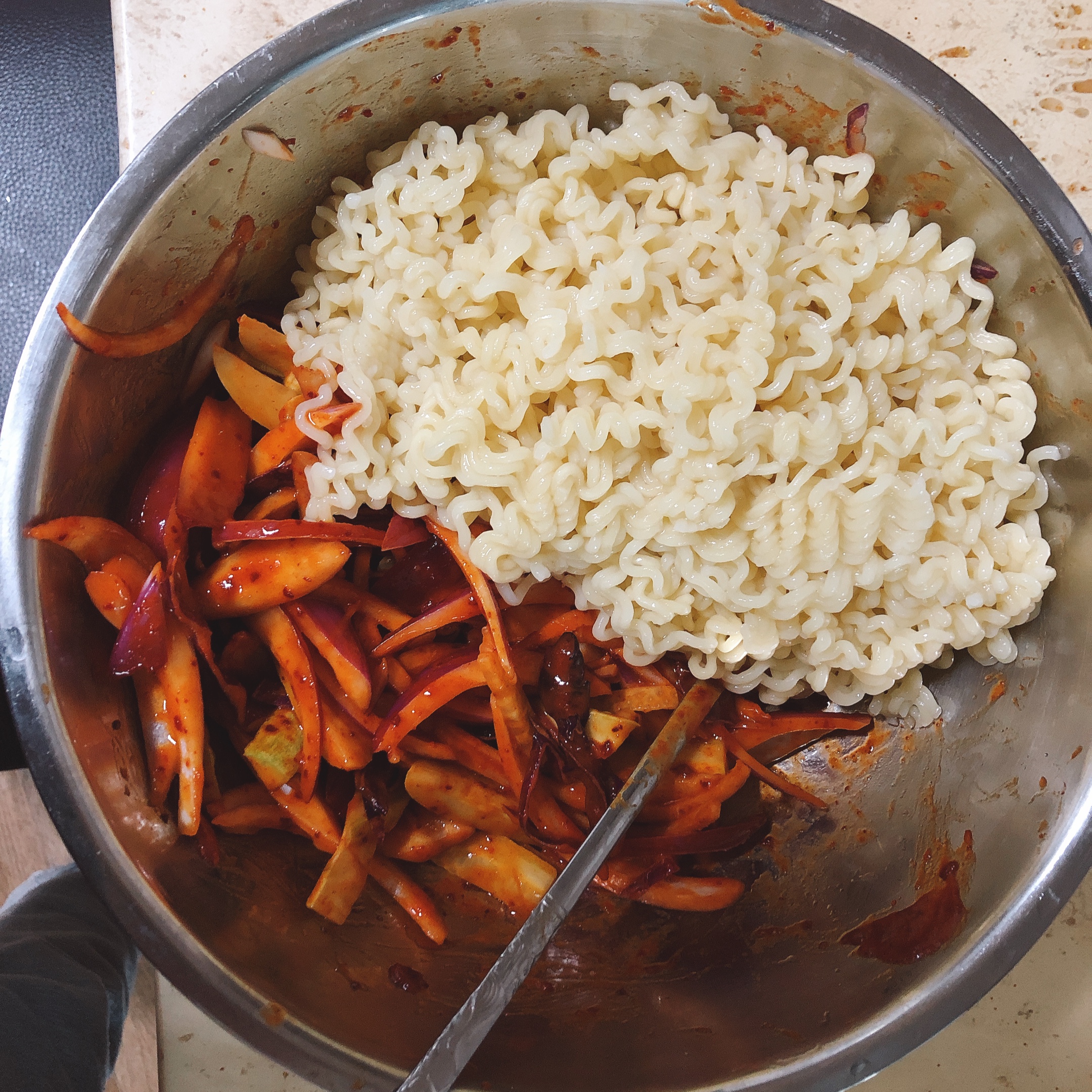 짜잔 완성했어요!! 비빔라면!! 너무 간단해서 누구나 다할 수 있어요!! 저도 요리를 잘하고 그런 게 아니지만 너무 간단하고 기본양념들만 있어도 돼서 자주 해 먹어요!! ㅎㅎ 배부르게 잘 먹었습니다..♥