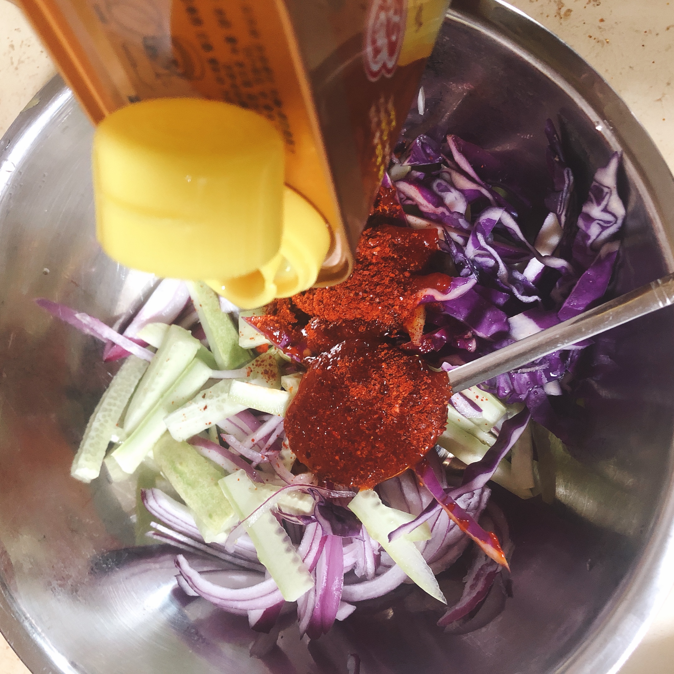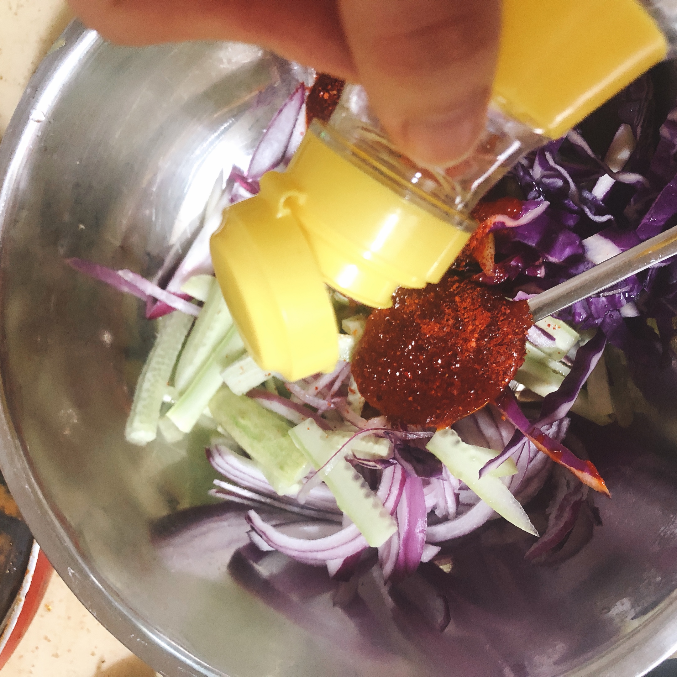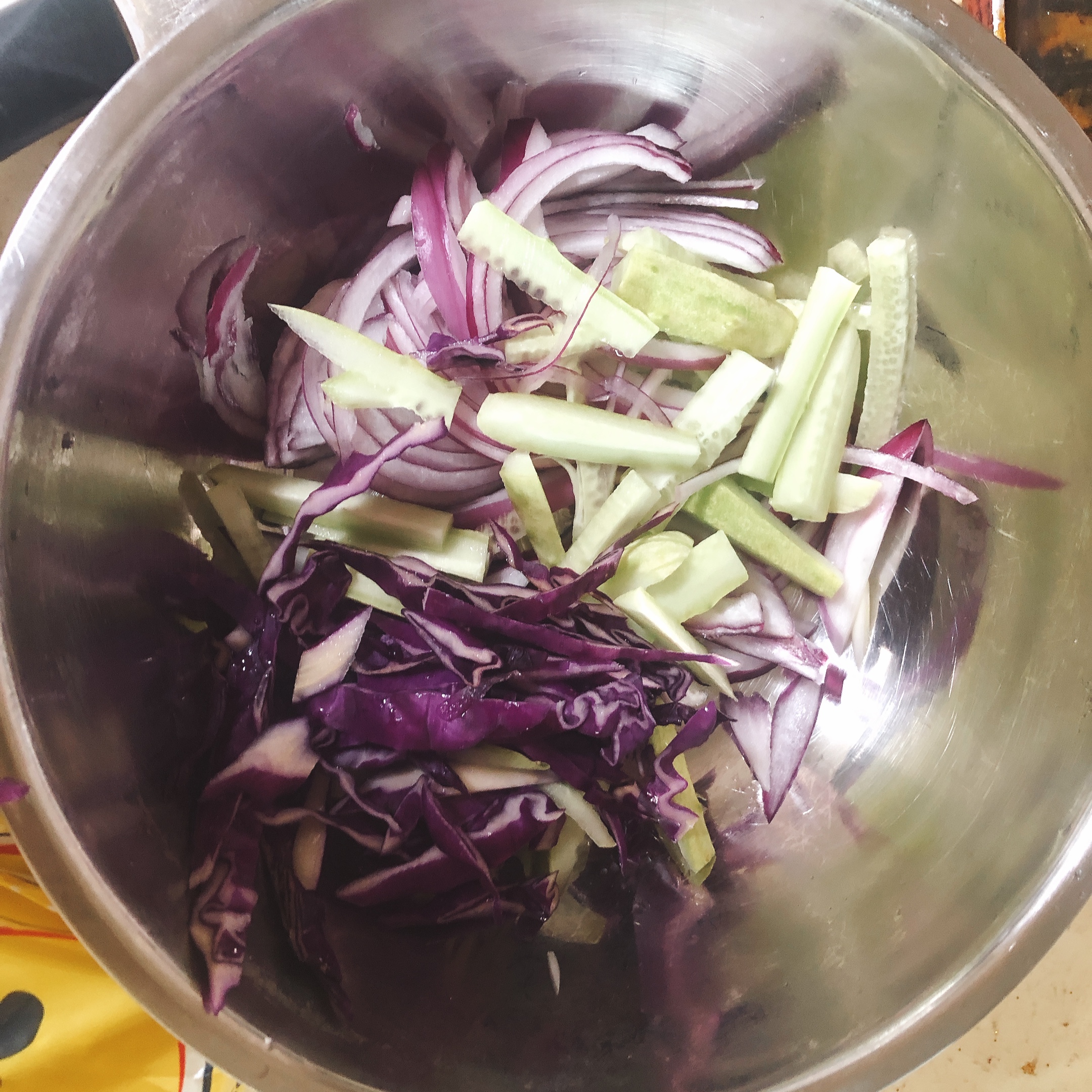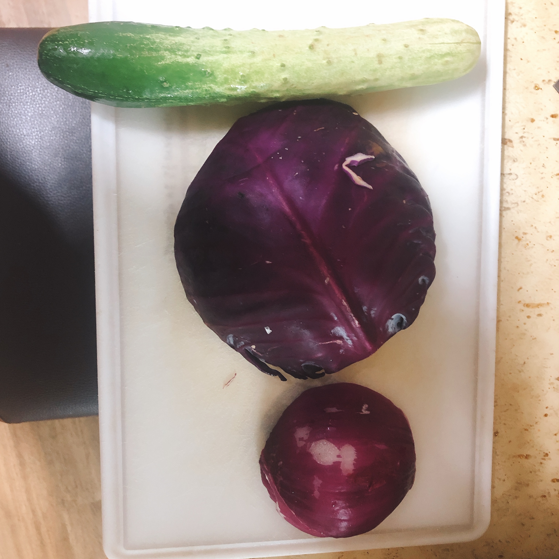 2인 분양으로 일단 준비 재료로는 오이 1개, 양파반, 양배추를 준비하였어요..! 여기서 야채 더 추가하셔도 되고 빼셔도 됩니다!! 저는 집에 있는 야채들로 준비해 봤어요!