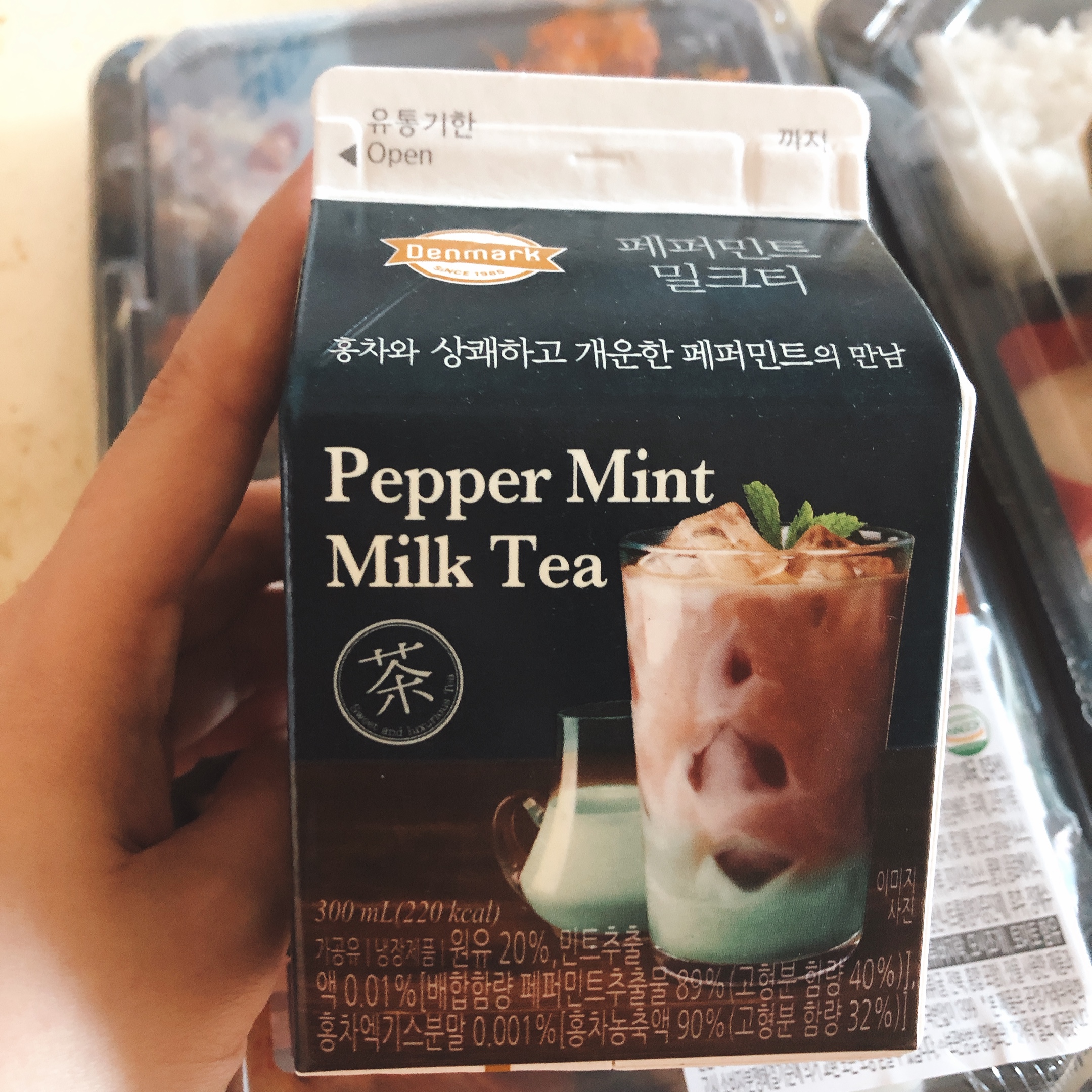 페퍼민트 밀크티 를 처음사서 먹어봤는데 .. 밀크티 그 특유의 맛때문에 별로 안좋아했는데 이건 진짜 달고 맛있더군요 특히 민트가 입을 시원하게 해주면서 달달해서 강추 합니다 ..! 도시락 밀크티 둘다 초이스 굿 !