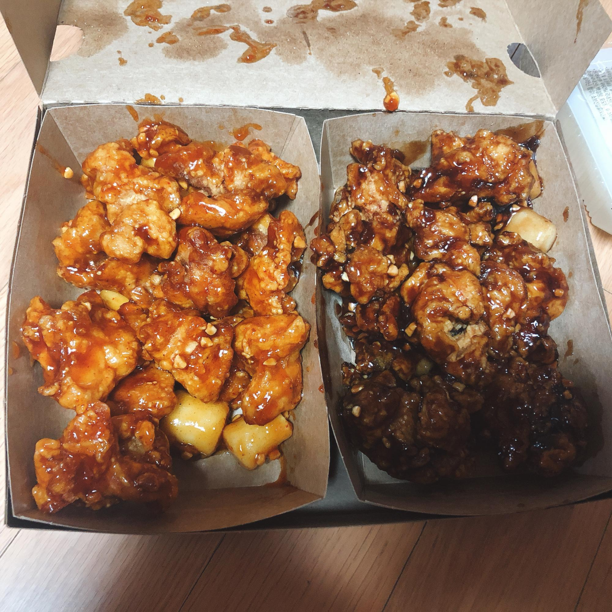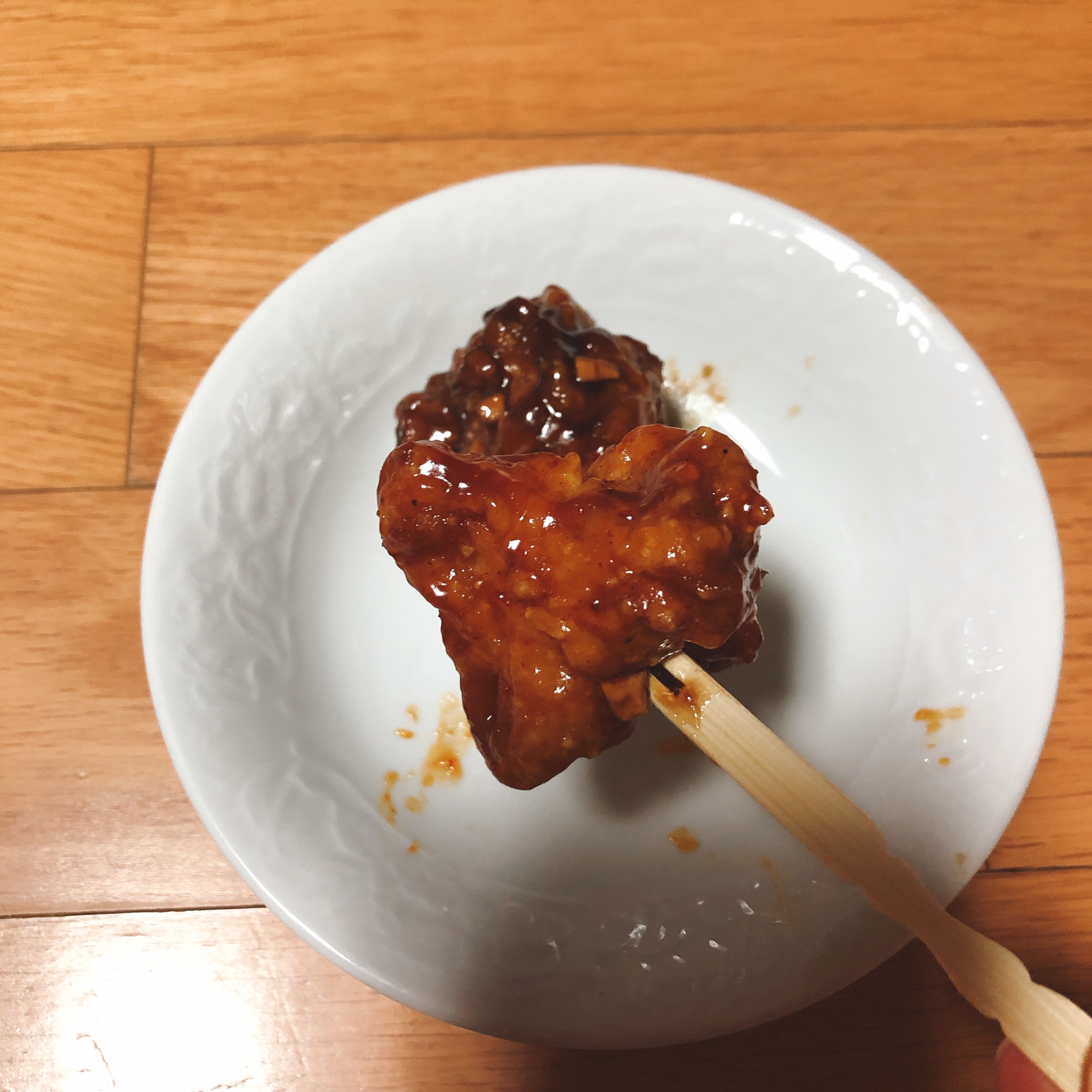 귀여운 꼬치 집게도 같이 넣어주셨어요 ㅎㅎ 맛은 역시 닭강정은 달달하죠 ! 올리고당맛이 많이났어요 ! 닭강정은 살보단 튀김껍질 맛으로 먹는거같아요! 겉에 튀김껍질이 많았습니다 ! 닭강정 생각 날때 가끔 시켜먹으면 괜찮을것같아요 ..!