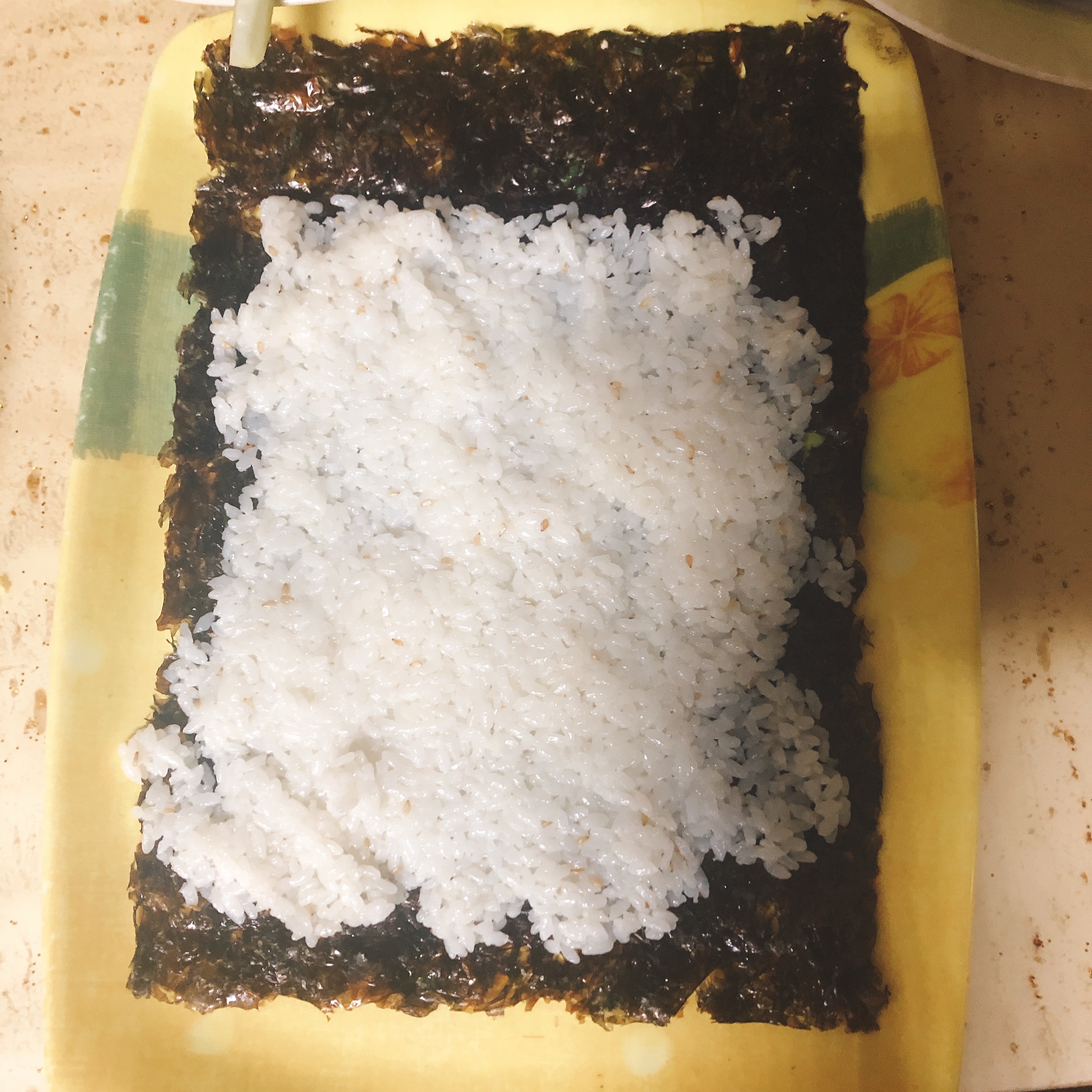 밥 간은 소금이랑 참기름이랑 깨랑 맛을보면서 간을 맞췄어요 ..! 김을 펴주시구요 ! 위에부분이랑아래부분은 눈대중으로 조금 남게 맞춰서 펴주세요..! 근데 역시 모든요리는 눈대중 같아요..! ㅋㅋ