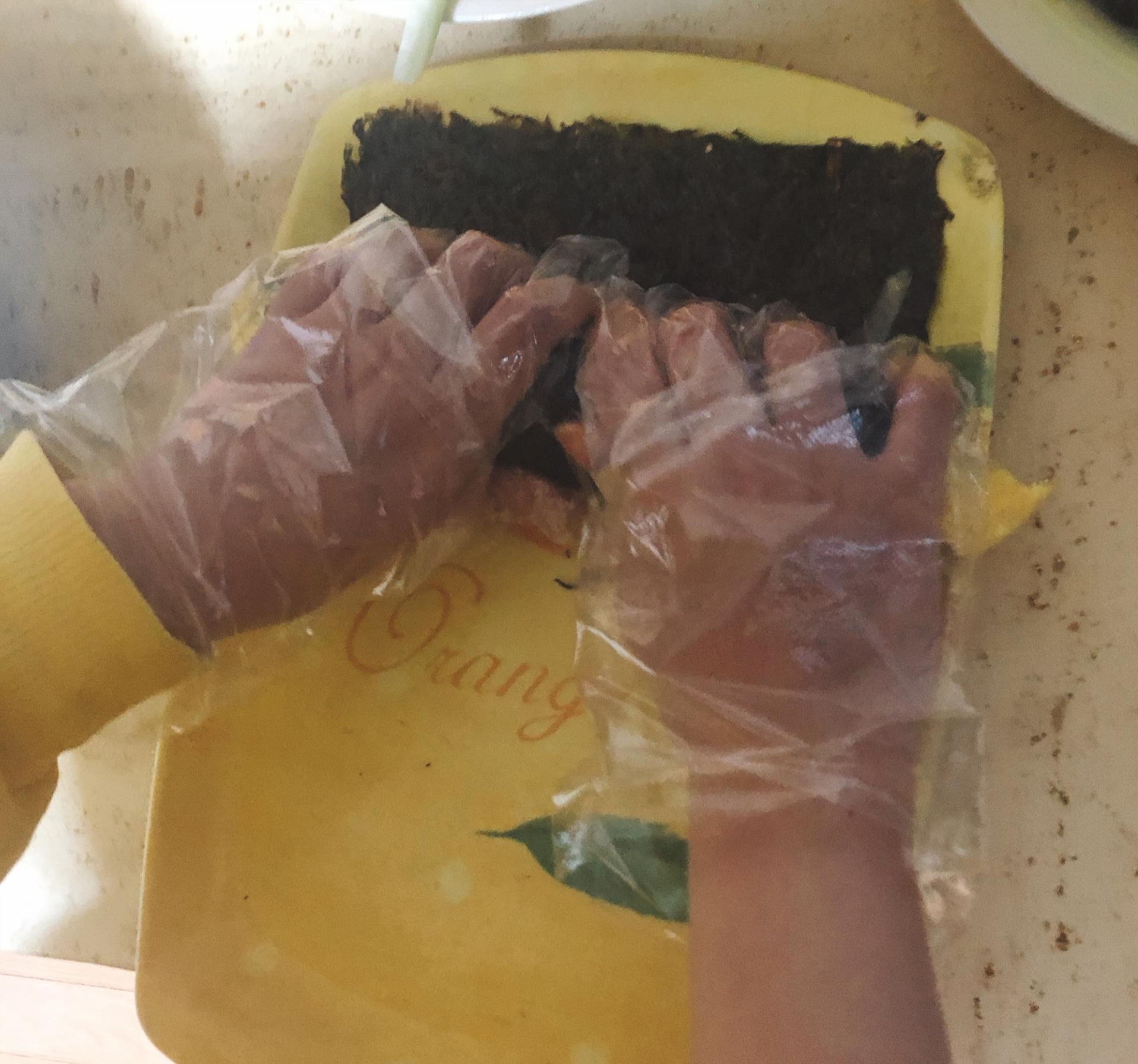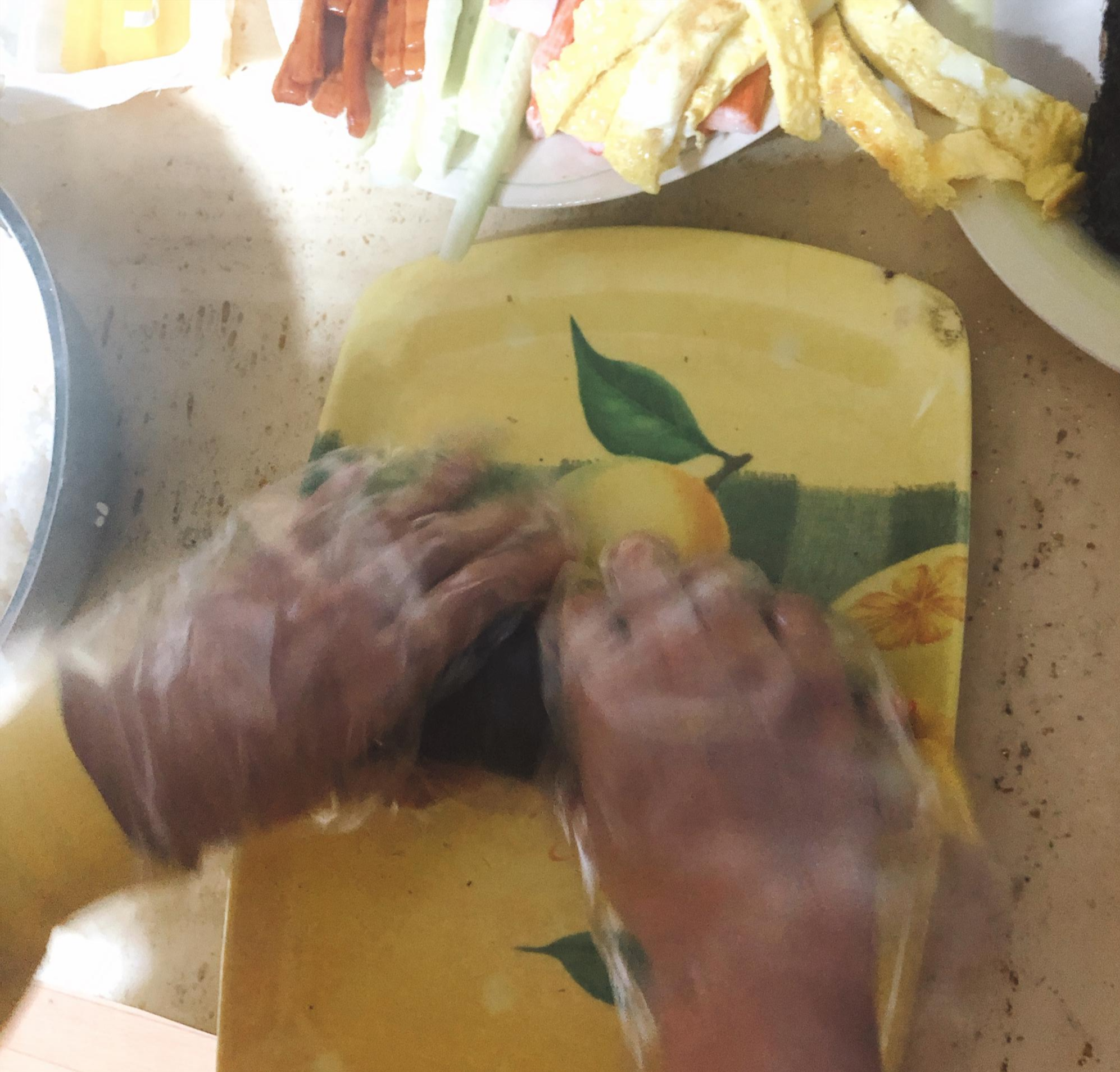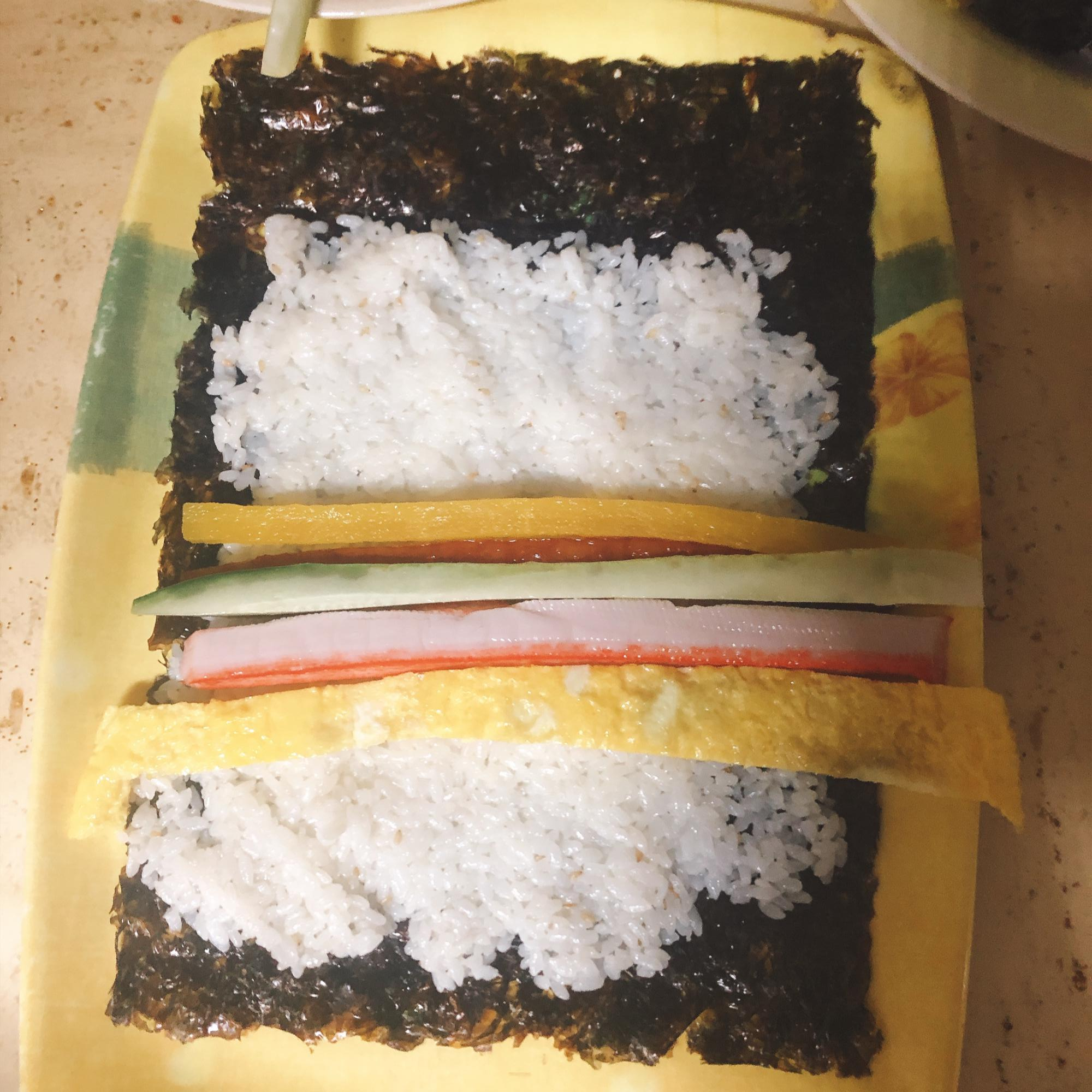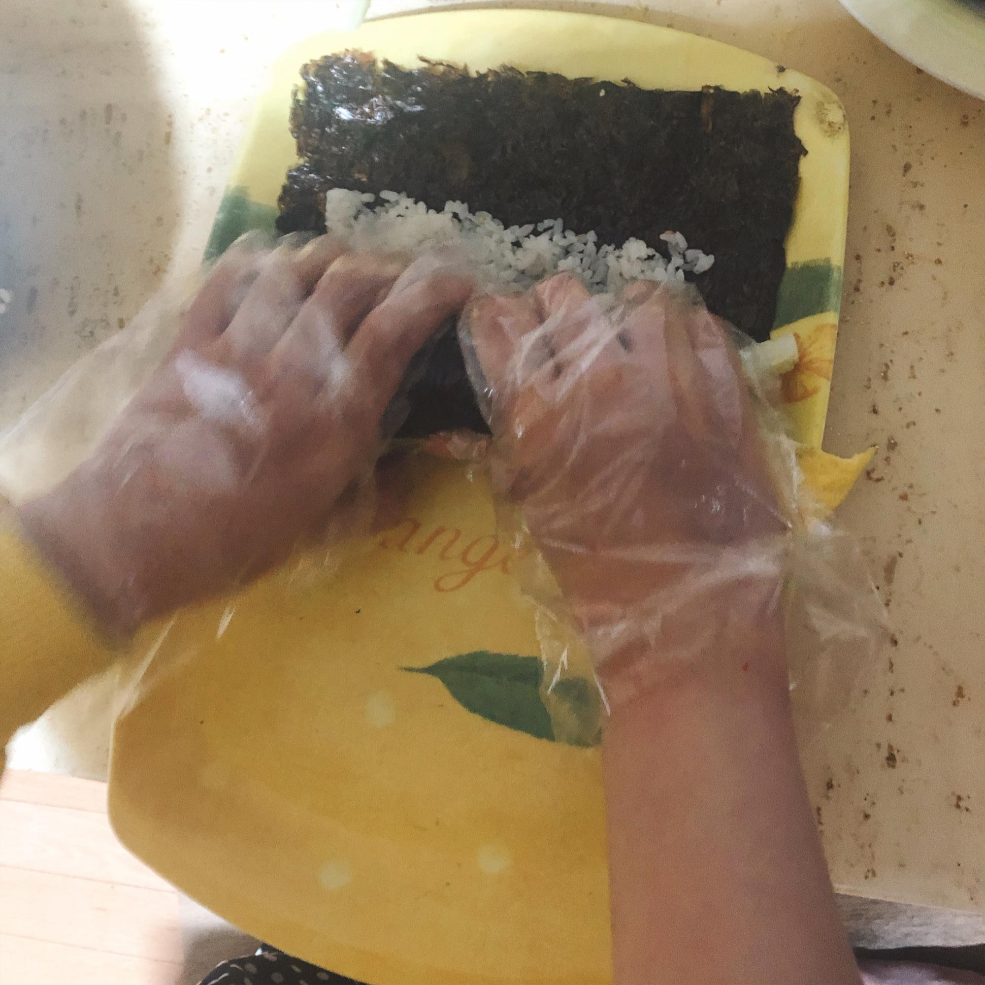 위에 부분은 마지막김이 잘붙을수 있도록 물을 발라주세요 ..! 저는 비닐장갑낀 손으로 살짝붙여서 발라주었어요 !