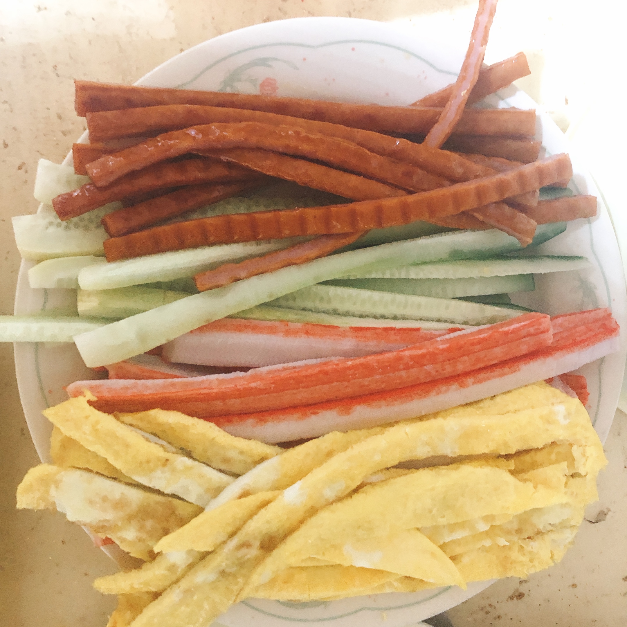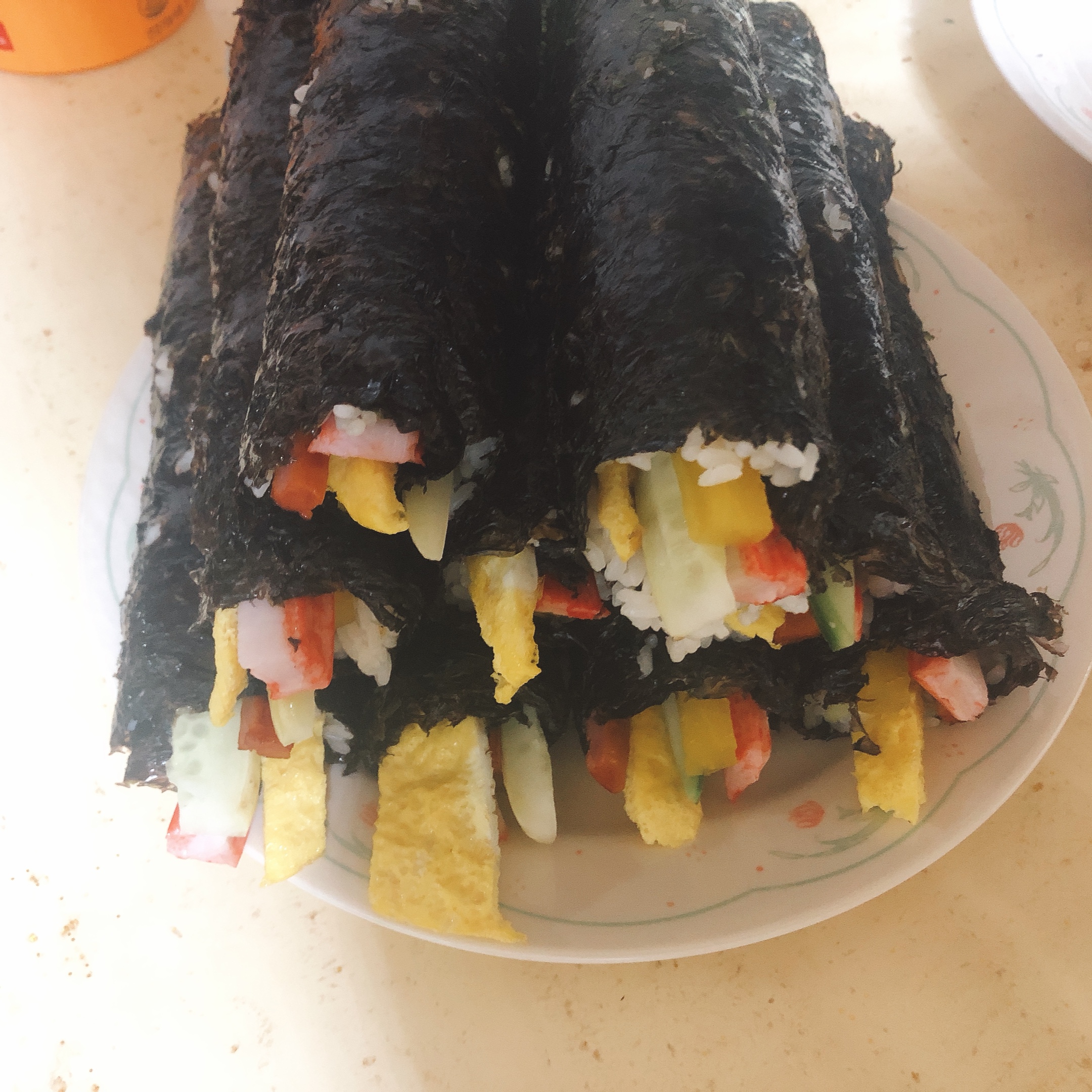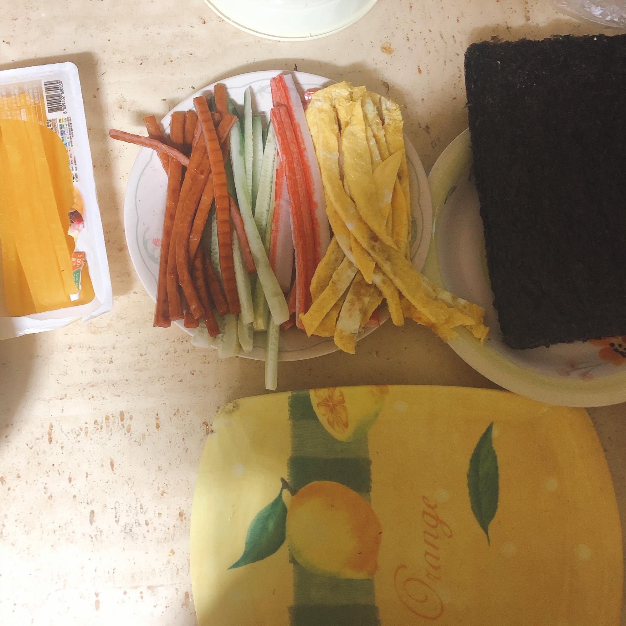 김밥재료가 있어서 김밥만들기 시작!! 정말 기본적인 재료만으로 만들어 봤어요 ! 슈퍼에서파는 김밥햄,맛살,오이,계란 끝입니다..! 정말 별거없죠 ㅋㅋ