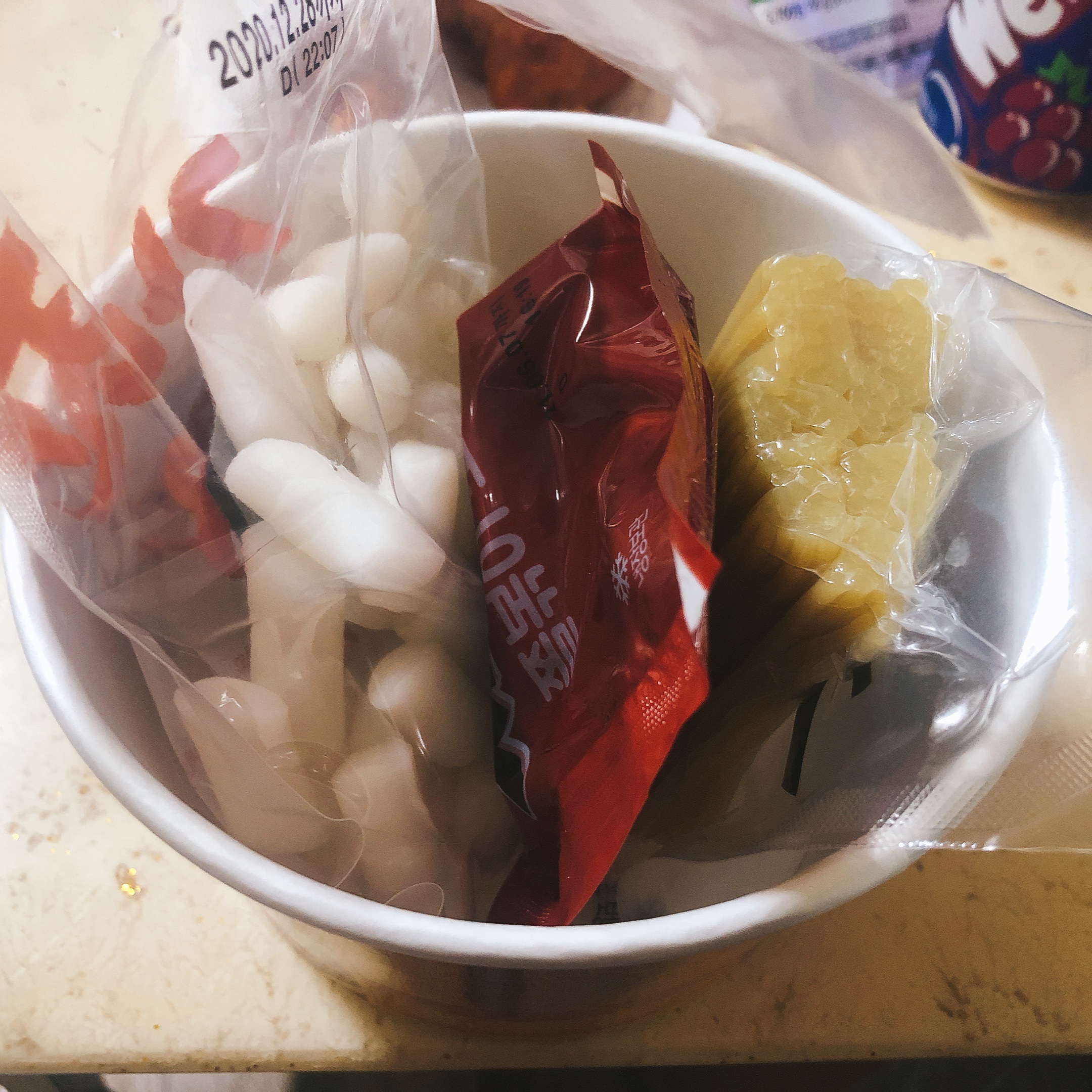 안에는 이렇게 생겼네요 !! 떡,쫄면, 떡볶이 세개가 컵안에 껴있어요 ..! 떡이 귀엽고 앙증맞네요 ㅎㅎ