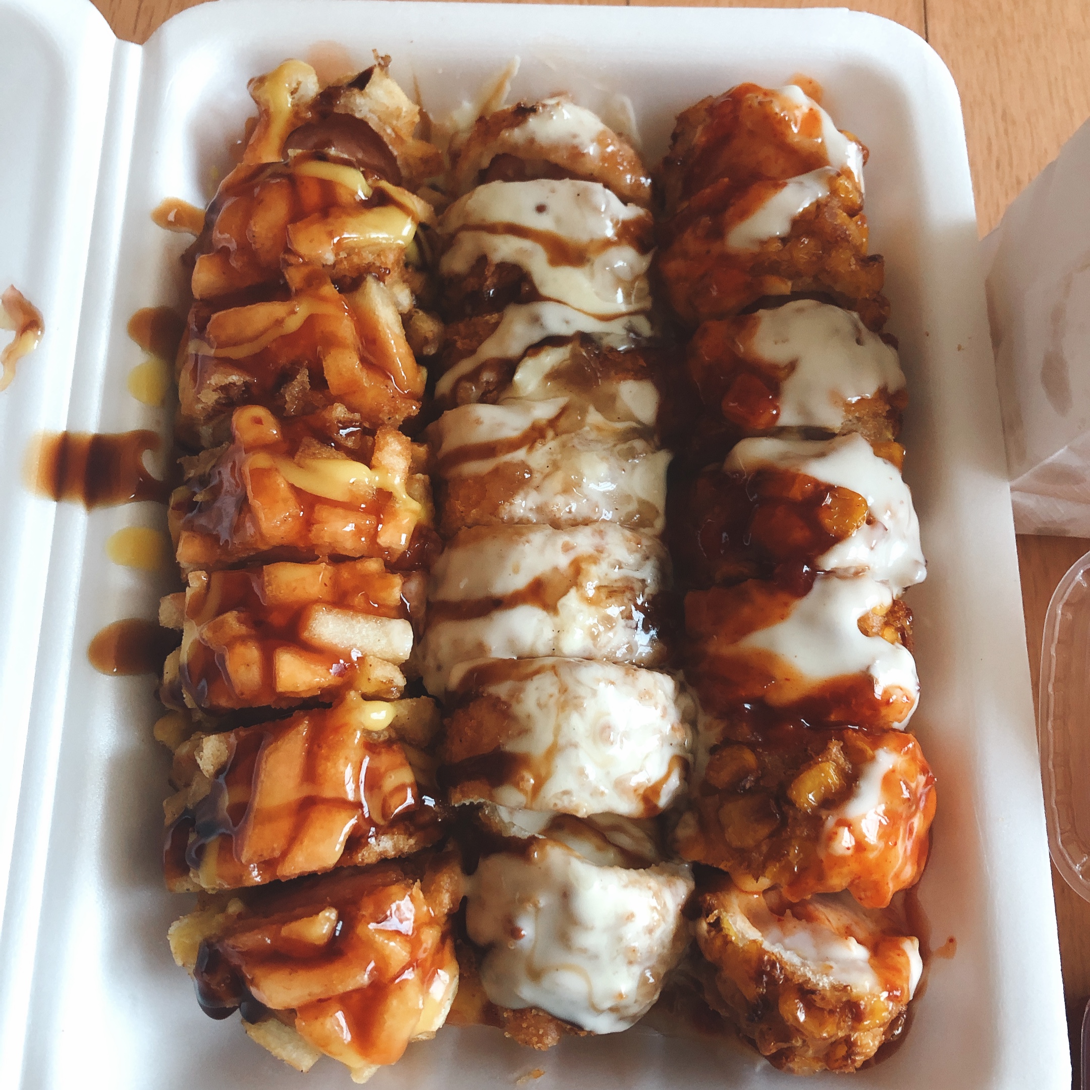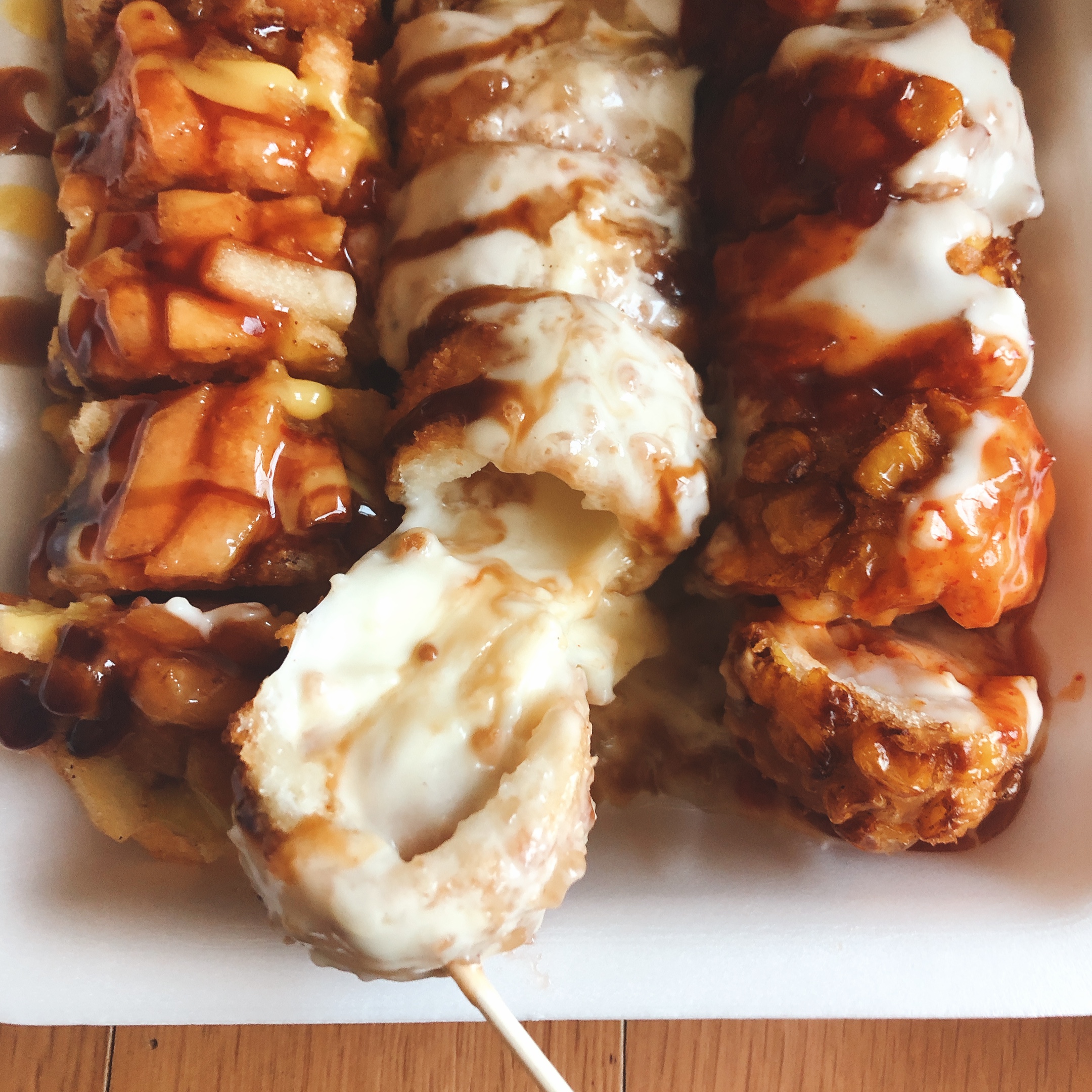 제가 제일 맛있었던 치즈도그 ! 위에 하얀색 소스가 새콤달콤한게 제입맛에 딱이더라구요 소스 덕후로..소스듬뿍뿌려먹는거 좋아합니당..ㅎㅎㅎ