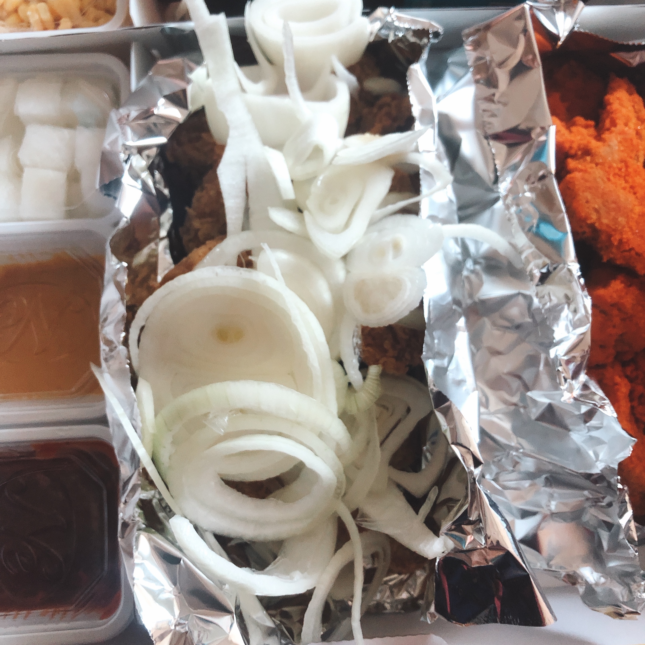 양파.. 직접 썰어주었습니다 ㅎㅎㅋㅋ 얇게 하고 싶었는데 잘안되더라구용 ㅎㅎ 그리고 부어주었어요 ㅎㅎ 그리고 소스까지 !! 맛은 살짝 매콤하고 달달 하다 ? 크리미언 을 먹어봐서 잘아는데 비슷한거 같아요 그냥 더 살짝 매콤하다? .. 전 차라리 크리미언 맛을 시켜서 먹을것 같네요 ㅎㅎ 치킨은 바삭하고 맛있었어요 ㅎ